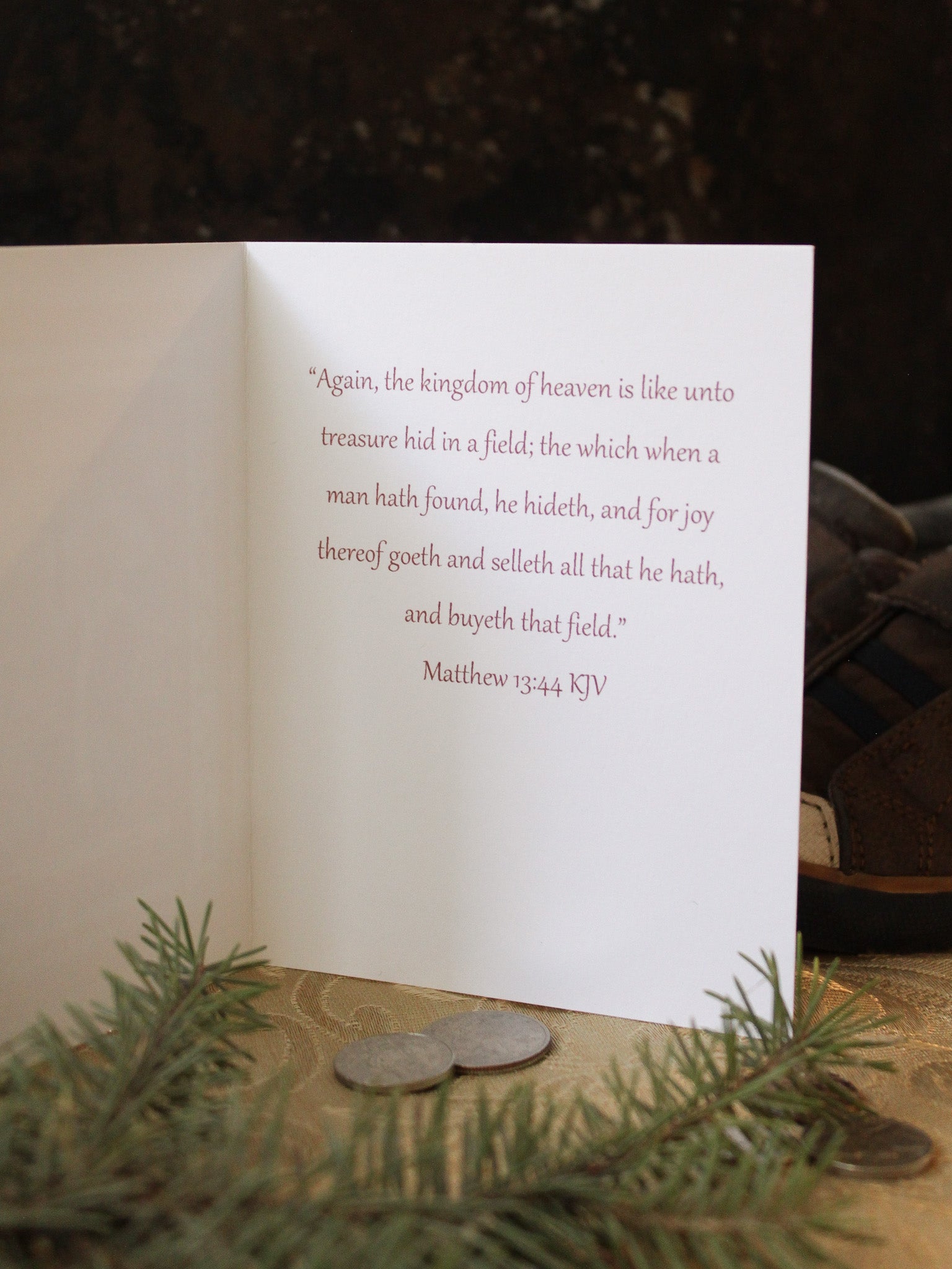 The original artwork depicts the Bishop of Myra, St. Nicholas, underneath the crucifix, gifting three gold pieces to one of the poor daughters upon whom he was famous for bestowing his generosity. The inside verse is “Again, the kingdom of heaven is like unto treasure hid in a field; the which when a man hath found, he hideth, and for joy thereof goeth and selleth all that he hath, and buyeth that field” Matthew 13:44 KJV.